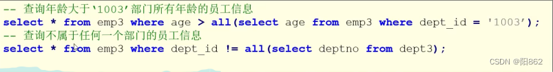 - ALL表示指定列中的值必須要大于子查詢集的每一個值,即必須要大于子查詢集的最大值;如果是小于號即小于子查詢集的最小值。同理可以推出其它的比較運算符的情況。