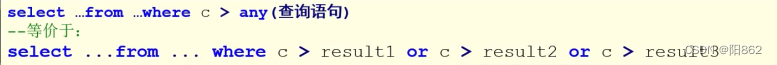 - ANY可以與=、>、>=、<、<=、<>結合是來使用,分別表示等于、大于、大于等于、小于、小于等于、不等于其中的其中的任何一個數(shù)據(jù)。