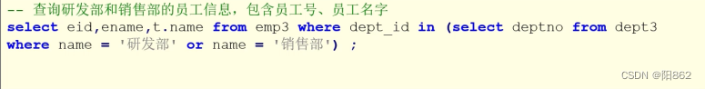 -- 查詢年齡最大的員工信息,顯示信息包含員工號、員工名字,員工年齡select * from emp3 where age=(select max(age) from emp3 ); select eid,ename ,age from emp3 where age = (select max (age) from emp3);-- 查詢年研發(fā)部和銷售部的員工信息,包含員工號、員工名字select * from emp3 where emp3.dept_id in (select deptno from dept3 d where d.name="研發(fā)部" or d.name="銷售部"); select eid,ename , t.name from emp3 where dept_id in (select deptno, name from dept3where name ="研發(fā)部"or name ="銷售部");-- 查詢研發(fā)部20歲以下的員工信息,包括員工號、員工名字,部門名字 -- 方式一:關聯(lián)查詢select * from dept3 d join emp3 e on d.deptno =e.dept_id and (d.name="研發(fā)部" and e.age<20); -- 方式二:子查詢select eid,age ,ename , name from (select * from dept3 where name = "研發(fā)部")t1 , (select * from emp3 where age <20) t2 where t1.deptno =t2.dept_id ; select eid,age ,ename , name from (select * from dept3 where name = "研發(fā)部")t1 join (select * from emp3 where age <20) t2 on t1.deptno =t2.dept_id ;