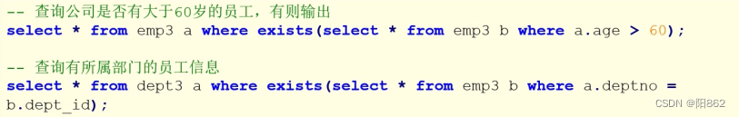 - EXISTS后面的子查詢不返回任何實際數(shù)據(jù),只返回真或假,當返回真時 where條件成立