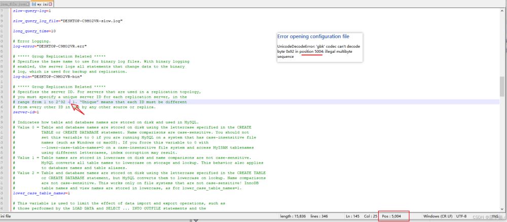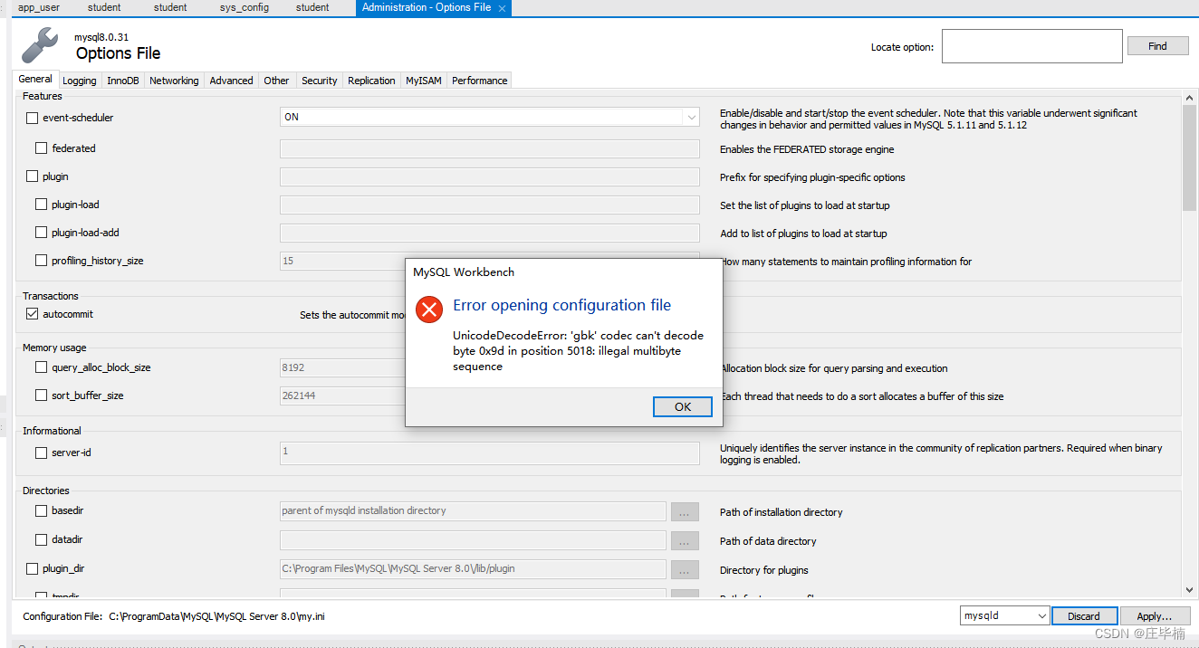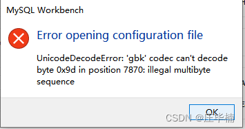 MySQL 8.0.31中使用MySQL Workbench提示配置文件錯(cuò)誤信息 Error opening configuration file UnicodeDecodeError:‘gbk’ coded can’t decode byte 0x92 in position 5004: illegal multibyte sequence