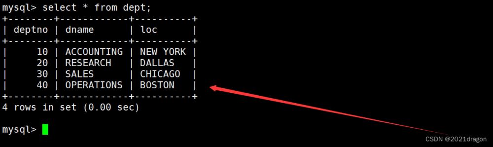 部門表中的dname代表的是部門名,deptno代表的是部門的部門號。如下:
