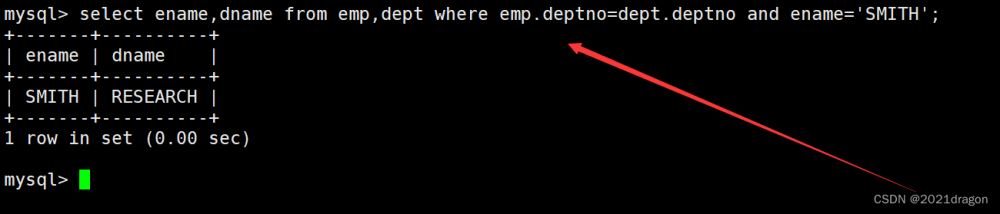 現在要顯示SMITH的名字和其所在部門的名稱,按照復合查詢的做法就是,取員工表和部門表的笛卡爾積,在where子句中指明篩選條件為員工的部門號等于部門的部門號,篩選出每個員工匹配的部門信息,并指明員工姓名為SMITH,篩選出SMITH的信息和其所在部門的信息。如下: