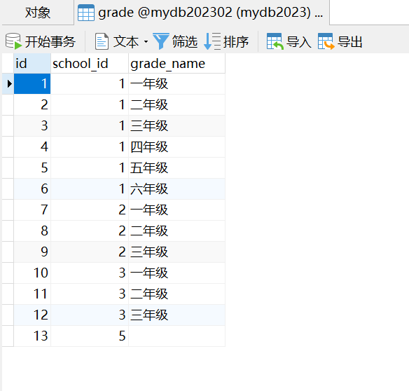 另一個是年級表(grade),包含年級的ID、學校ID和年級名稱: