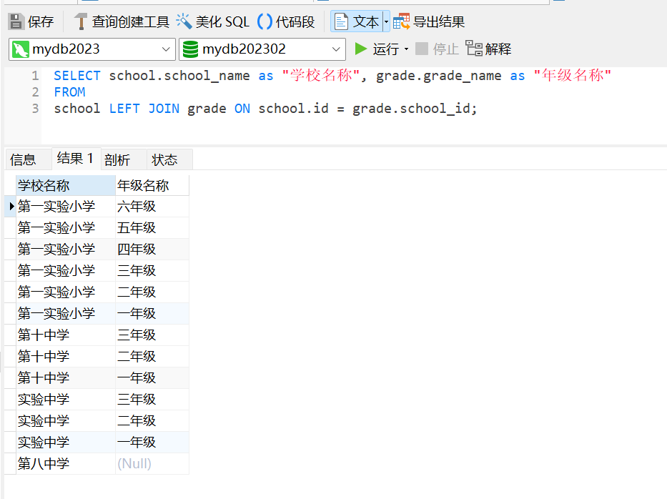 這將返回一個結果集,其中包含所有年級及其所屬學校信息,