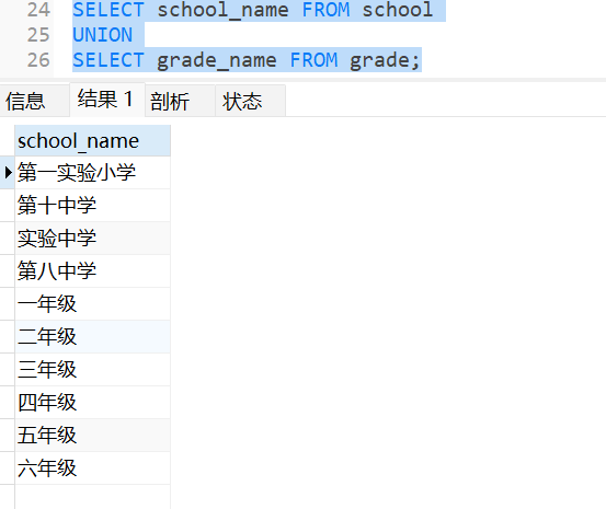 如果要將學校和年級的名稱分開,可以使用別名將兩個SELECT語句的結果列重命名: