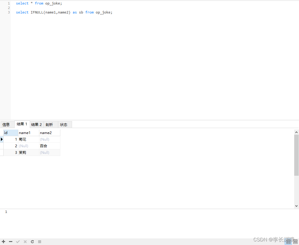 其中:如果 v1 不為 NULL,則 IFNULL 函數返回 v1; 否則返回 v2 的結果。