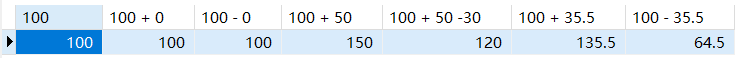 SELECT 100, 100 + 0, 100 - 0, 100 + 50, 100 + 50 -30, 100 + 35.5, 100 - 35.5FROM dual;