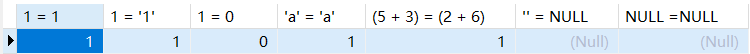 SELECT 1 = 1, 1 = "1", 1 = 0, "a" = "a", (5 + 3) = (2 + 6), "" = NULL , NULL = NULL;