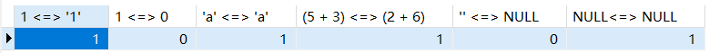 - 在兩個(gè)操作數(shù)均為NULL時(shí),其返回值為1,而不為NULL;