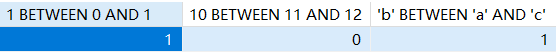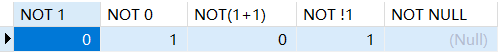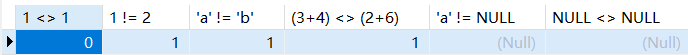 SELECT 1 <> 1, 1 != 2, "a" != "b", (3+4) <> (2+6), "a" != NULL, NULL <> NULL;