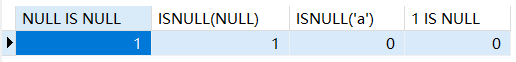 SELECT NULL IS NULL, ISNULL(NULL), ISNULL("a"), 1 IS NULL;