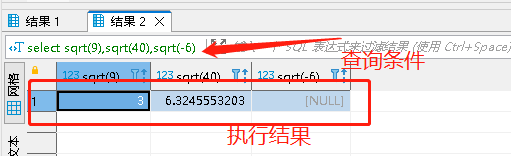 SQRT(x)返回非負數x的平方根。如果輸入3的平方等于9,因此9的平方根為3;40的平方根為6.324555320336759;而負數沒有平方根,因此-6返回的結果為NULL。