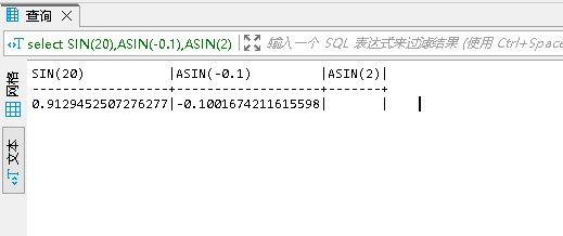 SIN(x)返回x的正弦值,其中x為弧度值。ASIN(x)返回x的反正弦值,即正弦為x的值。若x不在-1~1的范圍之內,則返回NULL。