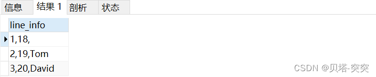 SELECT CONCAT(",",id,name,work_date) FROM employee_tbl; +-----------------------------+ | CONCAT(id, name, work_date) | +-----------------------------+ | 1,John,2022-08-24 | | 2,Ramr,2022-08-27 | | 3,Jack,2022-08-06 | | 3,Jack,2022-08-06 | | 4,Jill,2022-08-06 | | 5,Zara,2022-08-06 | | 5,Zara,2022-08-06 | +-----------------------------+3.group_concat()函數