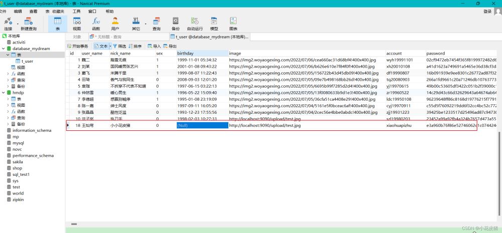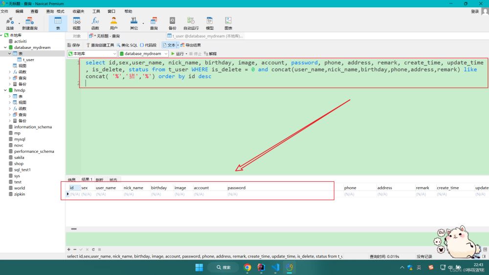 List<User> queryUserInfo(@Param("keyWord") String keyWord); <select id="queryUserInfo" resultType="com.wyh.entity.User">selectid,sex,user_name,nick_name,birthday,image,account,password,phone,address,remark,create_time,update_time,is_delete,statusfrom t_user<where> is_delete = 0 <if test="keyWord !=null and keyWord !=""">and concat(id,sex,user_name,nick_name,birthday,image,account, password,phone, address,remark, create_time,update_time,is_delete,status) like concat( "%",#{keyWord},"%") </if></where>order by id desc </select>接口測試