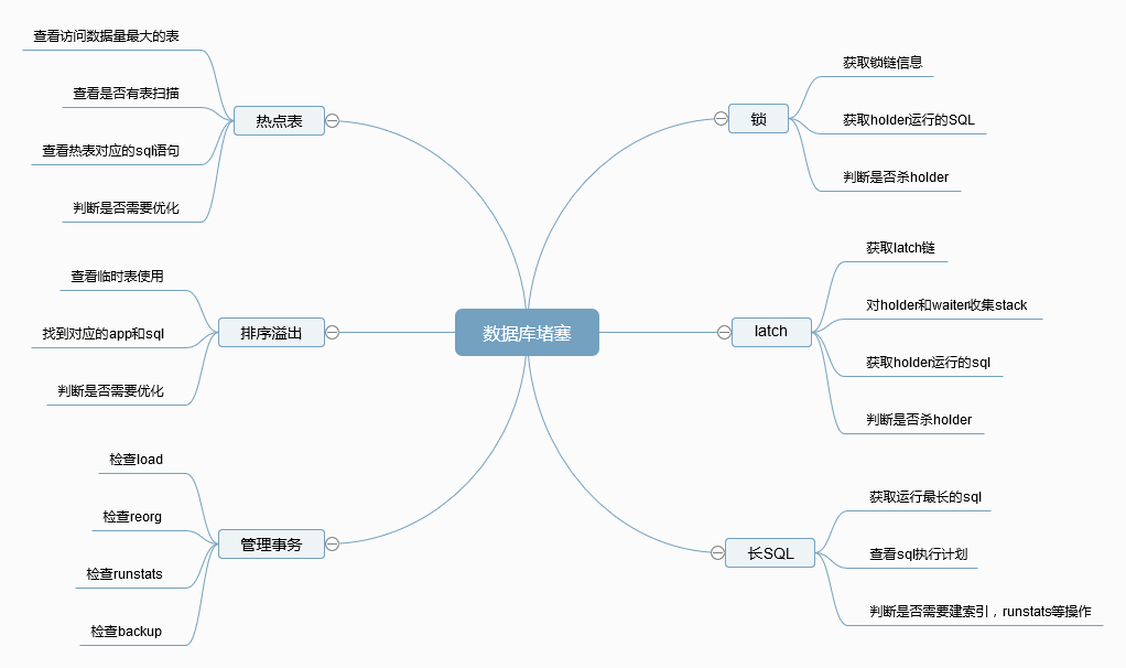 Db2 數據庫發生性能緩慢或者堵塞的最常見現象是數據庫活動會話激增,數據庫相關命令和語句運行緩慢。導致性能緩慢的原因有很多,最常見的可能是出現鎖問題。一個長 sql 堵塞其他相關 sql,導致短時間并發 sql 變多,系統變慢。也有可能是出現了大 sql,耗盡系統資源等。如下圖所示,我歸納列舉了一些常見的堵塞原因,整理了相關問題解決的方法。
