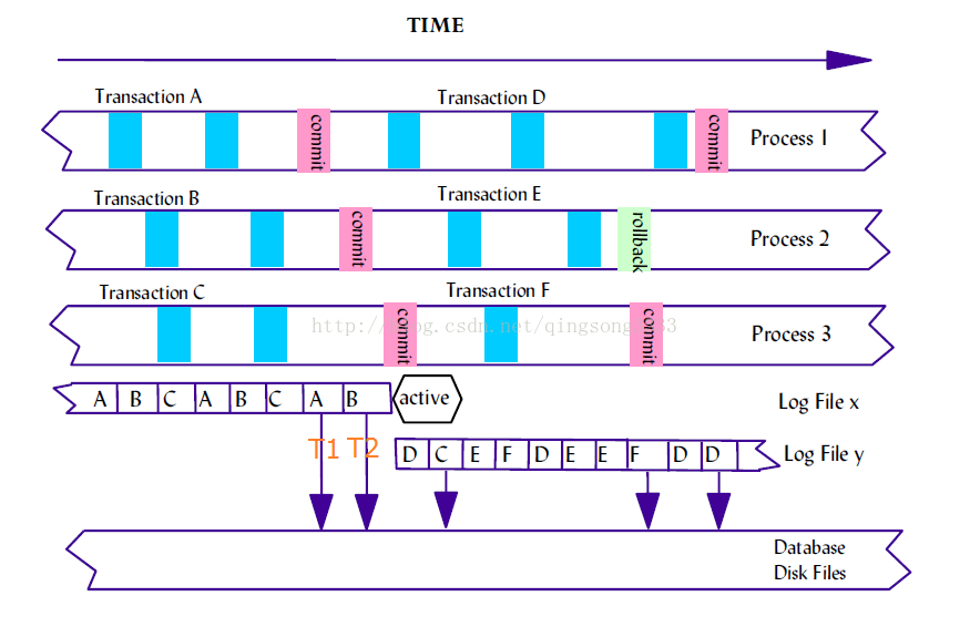 有3個并發的程序Process 1、Process 2、Process 3。每一個程序都有兩個事務。藍塊代表SQL語句,紅塊代表commit操作,綠塊代表rollback操作。每一個向下的箭頭都代表日志緩沖區的數據被刷新到日志磁盤上(默認是每一次提交操作都會導致日志緩沖被刷新到磁盤上)。