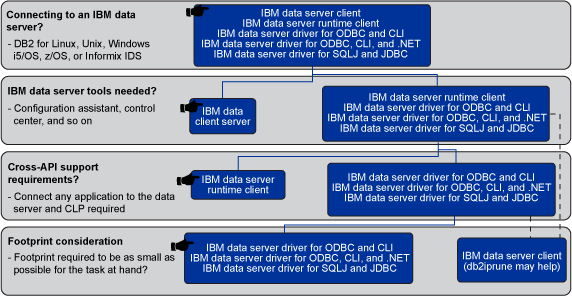 如果您的內存需求非常緊迫,則不適合使用這種占用空間較大的客戶機,但是它提供了針對任何應用程序連通性場景的充分支持。如果您支持使用各種編程語言構建的應用程序,并且不需要任何工具,那么這種客戶機是最佳選擇。如果支持像 Ruby on Rails 這樣的開源應用程序并且不需要工具,該客戶機則是惟一的選擇,因為驅動程序不會為 Ruby、PHP 這樣的開源 API 包含預編譯的二進制文件。