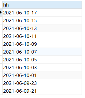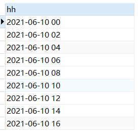 SELECT *FROM( SELECT DATE_FORMAT(CURDATE(),"%Y-%m-%d %H") AS hh UNION SELECT DATE_FORMAT(DATE_ADD(CURDATE(),INTERVAL 2 HOUR),"%Y-%m-%d %H") AS hh UNION SELECT DATE_FORMAT(DATE_ADD(CURDATE(),INTERVAL 4 HOUR),"%Y-%m-%d %H") AS hh UNION SELECT DATE_FORMAT(DATE_ADD(CURDATE(),INTERVAL 6 HOUR),"%Y-%m-%d %H") AS hh UNION SELECT DATE_FORMAT(DATE_ADD(CURDATE(),INTERVAL 8 HOUR),"%Y-%m-%d %H") AS hh UNION SELECT DATE_FORMAT(DATE_ADD(CURDATE(),INTERVAL 10 HOUR),"%Y-%m-%d %H") AS hh UNION SELECT DATE_FORMAT(DATE_ADD(CURDATE(),INTERVAL 12 HOUR),"%Y-%m-%d %H") AS hh UNION SELECT DATE_FORMAT(DATE_ADD(CURDATE(),INTERVAL 14 HOUR),"%Y-%m-%d %H") AS hh UNION SELECT DATE_FORMAT(DATE_ADD(CURDATE(),INTERVAL 16 HOUR),"%Y-%m-%d %H") AS hh UNION SELECT DATE_FORMAT(DATE_ADD(CURDATE(),INTERVAL 18 HOUR),"%Y-%m-%d %H") AS hh UNION SELECT DATE_FORMAT(DATE_ADD(CURDATE(),INTERVAL 20 HOUR),"%Y-%m-%d %H") AS hh UNION SELECT DATE_FORMAT(DATE_ADD(CURDATE(),INTERVAL 22 HOUR),"%Y-%m-%d %H") AS hh ) hourtable