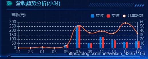 SELECT SUBSTRING(hourtable.hh,12)AS TIME, COALESCE(manytable.ss,0) ss, COALESCE(manytable.ys,0) ys,COALESCE(manytable.ddbs,0) ddbsFROM ( SELECT DATE_FORMAT((NOW() - INTERVAL 0 HOUR),"%Y-%m-%d-%H") AS hh UNION SELECT DATE_FORMAT((NOW() - INTERVAL 2 HOUR),"%Y-%m-%d-%H") AS hh UNION SELECT DATE_FORMAT((NOW() - INTERVAL 4 HOUR),"%Y-%m-%d-%H") AS hh UNION SELECT DATE_FORMAT((NOW() - INTERVAL 6 HOUR),"%Y-%m-%d-%H") AS hh UNION SELECT DATE_FORMAT((NOW() - INTERVAL 8 HOUR),"%Y-%m-%d-%H") AS hh UNION SELECT DATE_FORMAT((NOW() - INTERVAL 10 HOUR),"%Y-%m-%d-%H") AS hh UNION SELECT DATE_FORMAT((NOW() - INTERVAL 12 HOUR),"%Y-%m-%d-%H") AS hh UNION SELECT DATE_FORMAT((NOW() - INTERVAL 14 HOUR),"%Y-%m-%d-%H") AS hh UNION SELECT DATE_FORMAT((NOW() - INTERVAL 16 HOUR),"%Y-%m-%d-%H") AS hh UNION SELECT DATE_FORMAT((NOW() - INTERVAL 18 HOUR),"%Y-%m-%d-%H") AS hh UNION SELECT DATE_FORMAT((NOW() - INTERVAL 20 HOUR),"%Y-%m-%d-%H") AS hh) hourtable LEFT JOIN ( SELECT DATE_FORMAT(o.updated_at, "%Y-%m-%d-%H") xh, COALESCE(SUM( o.amount_paid ) ,0) ss, COALESCE(SUM( o.amount_payable ),0) ys, COALESCE(COUNT( o.record_key ),0) ddbs, park_key as pid FROM p_park_record o WHERE DATE_FORMAT( o.updated_at, "%Y-%m-%d-%H" ) > DATE_FORMAT( ( NOW( ) - INTERVAL 20 HOUR ), "%Y-%m-%d-%H" ) GROUP BY DATE_FORMAT(o.updated_at, "%Y-%m-%d-%H"),pid ) manytable ON hourtable.hh = manytable.xh<if test="parkId != null and parkId != """> AND manytable.pid = #{parkId}</if> ORDER BY hourtable.hh效果: