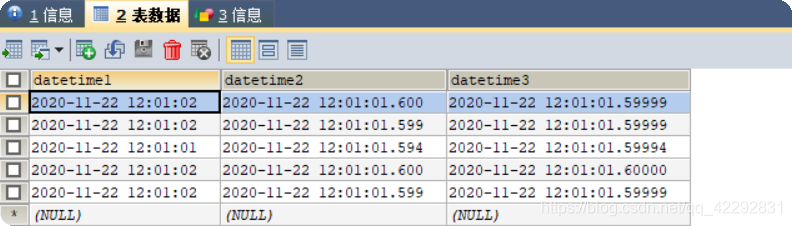 -- 創建數據庫CREATE DATABASE mydb_1;-- 查看創建數據庫建表語句(默認編碼UTF8)SHOW CREATE DATABASE mydb_1;-- 創建表-- 測試datetime的精度CREATE TABLE test( -- 默認精度為0 -- Maximum is 6. datetime1 DATETIME, datetime2 DATETIME(3), datetime3 DATETIME(5));INSERT INTO test VALUES("2020-11-22 12:01:01.59999", "2020-11-22 12:01:01.59999", "2020-11-22 12:01:01.59999");INSERT INTO test VALUES("2020-11-22 12:01:01.5", "2020-11-22 12:01:01.599", "2020-11-22 12:01:01.59999");INSERT INTO test VALUES("2020-11-22 12:01:01.4", "2020-11-22 12:01:01.594", "2020-11-22 12:01:01.59994");INSERT INTO test VALUES("2020-11-22 12:01:01.5", "2020-11-22 12:01:01.5995", "2020-11-22 12:01:01.599995");INSERT INTO test VALUES("2020-11-22 12:01:01.5", "2020-11-22 12:01:01.5994", "2020-11-22 12:01:01.599994");-- 創建表-- 測試timestamp的精度CREATE TABLE test11( -- 默認精度為0 -- Maximum is 6. datetime1 TIMESTAMP, datetime2 TIMESTAMP(3), datetime3 TIMESTAMP(5));INSERT INTO test1 VALUES("2020-11-22 12:01:01.59999", "2020-11-22 12:01:01.59999", "2020-11-22 12:01:01.59999");INSERT INTO test1 VALUES("2020-11-22 12:01:01.5", "2020-11-22 12:01:01.599", "2020-11-22 12:01:01.59999");INSERT INTO test1 VALUES("2020-11-22 12:01:01.4", "2020-11-22 12:01:01.594", "2020-11-22 12:01:01.59994");INSERT INTO test1 VALUES("2020-11-22 12:01:01.5", "2020-11-22 12:01:01.5995", "2020-11-22 12:01:01.599995");INSERT INTO test1 VALUES("2020-11-22 12:01:01.5", "2020-11-22 12:01:01.5994", "2020-11-22 12:01:01.599994");