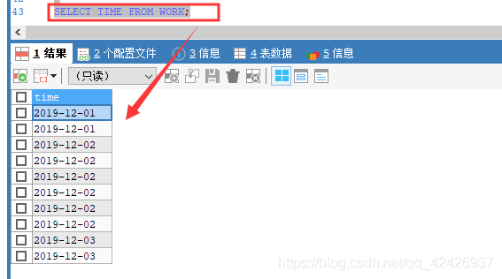 我的MySQL數(shù)據(jù)庫中有張名為"WORK"的表,其中"time"字段存儲的是"datatime"類型的數(shù)據(jù),格式為"yyyy-MM-dd HH:mm:ss",
