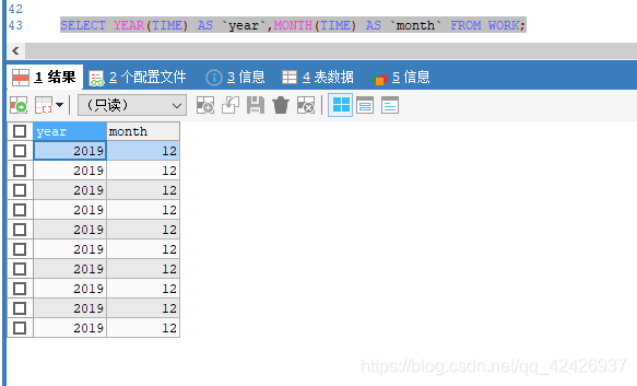 SELECT YEAR(TIME) AS `year`,MONTH(TIME) AS `month` FROM WORK;