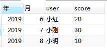 select year(time) ‘年" , month(time) ‘月", user , scoreFROM timewhere year(time) = 2019group by year(time), month(time)