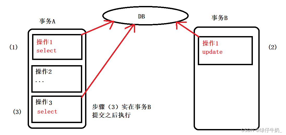 同樣事務AB并發下操作數據庫中同一數據,首先事務A對該數據進行查詢,查詢之后又進行了其他操作。與此同時,事務B執行了更新操作并且成功commit。那么當事務A再次對數據庫查詢的時候就會出現與上次讀取到的數據不一致的情況
