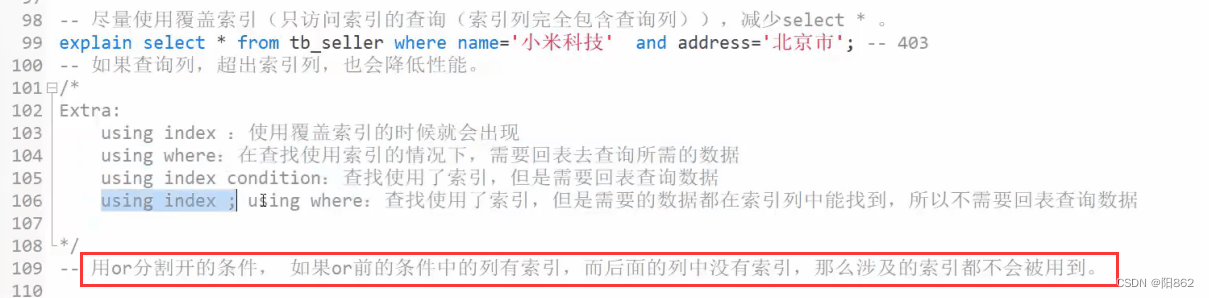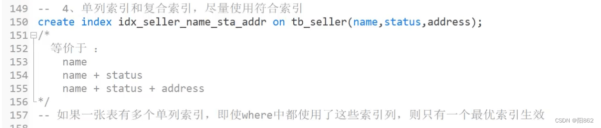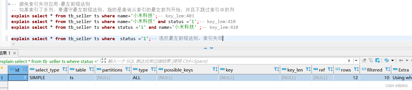 -- 避免索引失效應用-最左前綴法則-- 如果索引了多列,要遵守最左前綴法則,指的是查詢從索引的最左前列開始,并且不跳過索引中的列explain select * from tb_seller ts where name="小米科技";-- key_lem:403explain select * from tb_seller ts where name="小米科技" and status ="1";-- key_lem:410explain select * from tb_seller ts where status ="1" and name="小米科技" ;-- key_lem:410,依然跟順序無關 -- 違反最左前綴法則,索引失效explain select * from tb_seller ts where status ="1";-- 違反最左前綴法則,索引失效 -- 如果符合最左前綴法則,但是出現跳躍某一列,只有最左列索引生效explain select * from tb_seller where name="小米科技" and address="北京市";-- key_lem:403