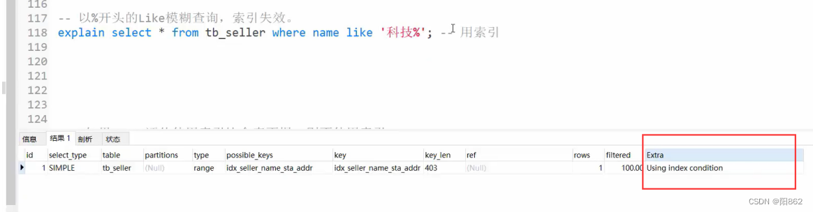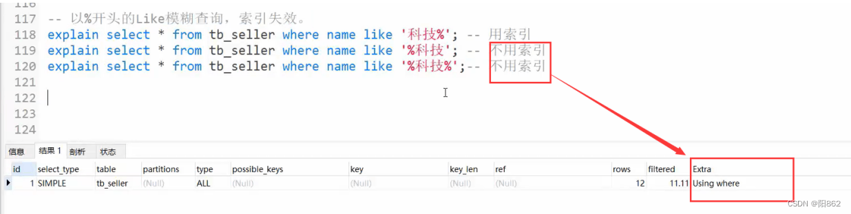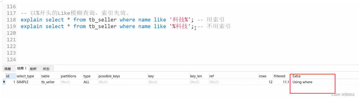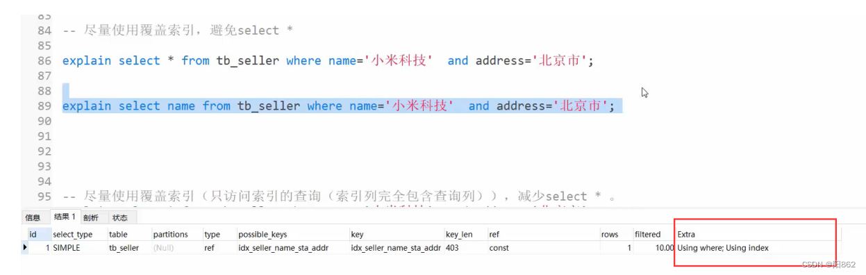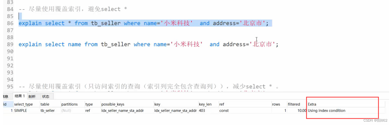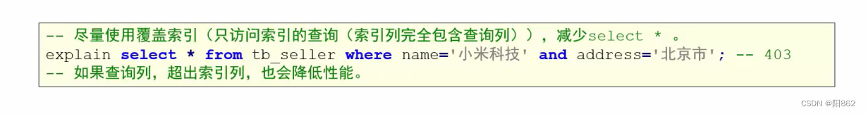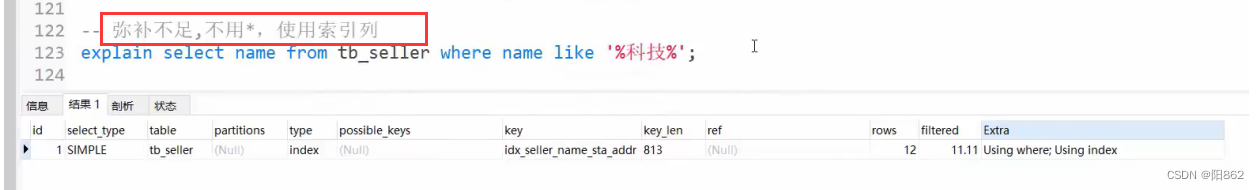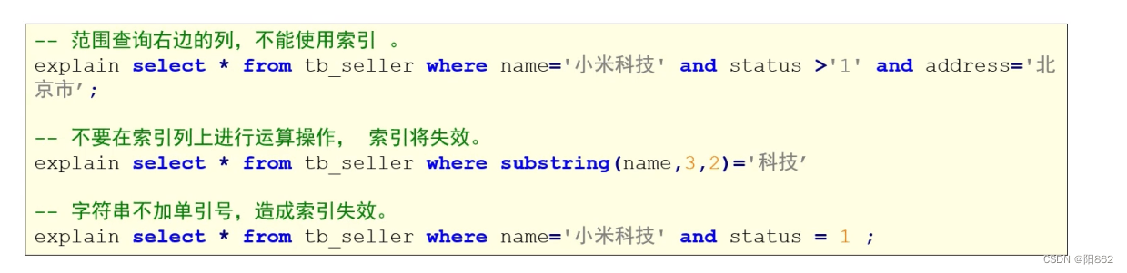-- 避免索引失效應用-其他匹配原則-- 范圍查詢右邊的列,不能使用索引explain select * from tb_seller where name= "小米科技" and status >"1" and address="北京市";-- key_lem:410,沒有使用status這個索引-- 不要在索引列上進行運算操作,索引將失效。explain select * from tb_seller where substring(name,3,2) ="科技";-- 沒有使用索引-- 字符串不加單引號,造成索引失效。explain select * from tb_seller where name="小米科技" and status = 1 ;-- key_lem:403,沒有使用status這個索引