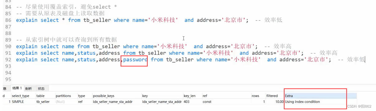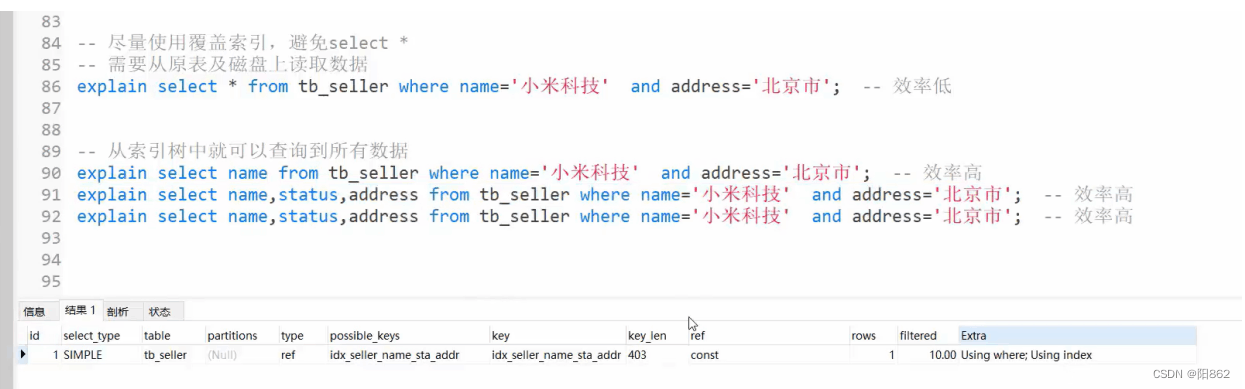 -- 避免索引失效應用-全值匹配-- 全值匹配,和字段匹配成功即可,和字段順序無關explain select * from tb_seller ts where name ="小米科技" and status ="1" and address ="北京市"; explain select * from tb_seller ts where status ="1" and name ="小米科技" and address ="北京市";