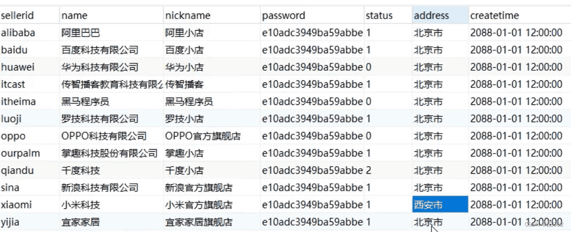 use world; create table tb_seller( sellerid varchar(100), name varchar(100), nickname varchar(50), password varchar(60), status varchar(1), address varchar(100), createtime datetime, primary key(sellerid)); insert into tb_seller values("alibaba","阿里巴巴","阿里小店","e10adc3949ba59abbe057f20f883e","1","北京市","2088-01-01 12:00:00"), ("baidu","百度科技有限公司","百度小店","e10adc3949ba59abbe057f20f883e","1","北京市","2088-01-01 12:00:00"), ("huawei","華為科技有限公司","華為小店","e10adc3949ba59abbe057f20f883e","0","北京市","2088-01-01 12:00:00"), ("itcast","傳智播客教育科技有限公司","傳智播客","e10adc3949ba59abbe057f20f883e","1","北京市","2088-01-01 12:00:00"), ("itheima","黑馬程序員","黑馬程序員","e10adc3949ba59abbe057f20f883e","0","北京市","2088-01-01 12:00:00"), ("luoji","羅技科技有限公司","羅技小店","e10adc3949ba59abbe057f20f883e","1","北京市","2088-01-01 12:00:00"), ("oppo","oppo科技有限公司","oppo官方旗艦店","e10adc3949ba59abbe057f20f883e","0","北京市","2088-01-01 12:00:00"), ("ourpalm","掌趣科技股份有限公司","掌趣小店","e10adc3949ba59abbe057f20f883e","1","北京市","2088-01-01 12:00:00"), ("qiandu","千度科技","千度小店","e10adc3949ba59abbe057f20f883e","2","北京市","2088-01-01 12:00:00"), ("sina","新浪科技有限公司","新浪官方旗艦店","e10adc3949ba59abbe057f20f883e","1","北京市","2088-01-01 12:00:00"), ("xiaomi","小米科技","小米官方旗艦店","e10adc3949ba59abbe057f20f883e","1","西安市","2088-01-01 12:00:00"), ("yijia","宜家家居","宜家官方旗艦店","e10adc3949ba59abbe057f20f883e","1","北京市","2088-01-01 12:00:00"); -- 創建組合索引create index index_seller_name_sta_addr on tb_seller(name,status,address);避免索引失效應用-全值匹配
