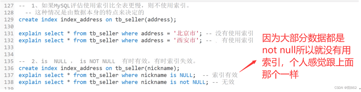 5、 如果MySQL評估使用索引比全表更慢,則不使用索引。is NULL , is NOT NULL有時有效,有時索引失效。in走索引,not in索引失效。單列索引和復合索引,盡量使用符合索引