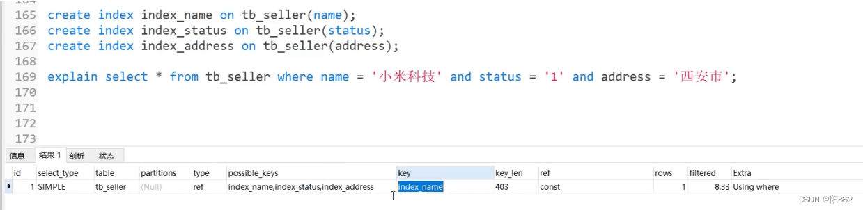 創建了單一的三個索引,最后面where全使用了但explain顯示只用了index_name