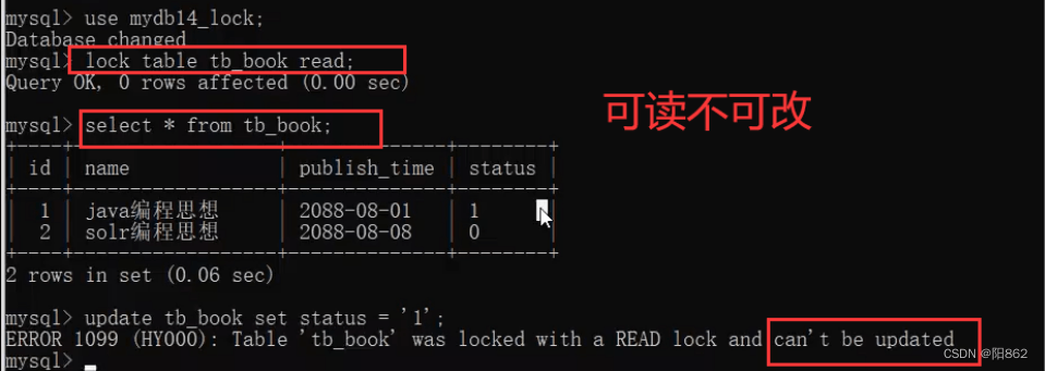 加了讀鎖后只能看自己的表,不能修改,也不能看其他的表