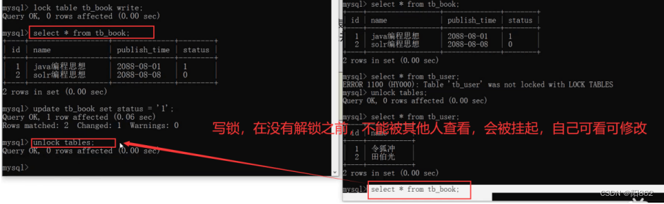 create table tb_book( id int(11) auto_increment, name varchar(50) default null, publish_time date default null, status char(1) default null, primary key (id))engine=myisam default charset=utf8; insert into tb_book values(null,"sql","2088-08-01","1");insert into tb_book values(null,"sql",20880908,"0"); create table tb_user( id int(11) auto_increment, name varchar(50) default null, primary key (id) )engine =myisam default charset=utf8; insert into tb_user values(null,"張三");insert into tb_user values(null,"李四"); -- 加寫鎖lock table tb_book write; select * from tb_book ;-- 能正常輸出select * from tb_book tb ;-- 不能正常輸出,不能有別名update tb_book set status=1;-- 可以修改 寫鎖:可讀可修改,但在沒有解鎖之前不能被其他人查看,會被掛起 select * from tb_user ;-- 不能正常輸出,當鎖住一個表時也不能看其他表-- 解鎖unlock tables;