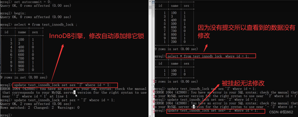 -- 行鎖 drop table is exists test_innodb_lock;create table test_innodb_lock( id int(11), name varchar(16), sex varchar(1))engine=innodb; insert into test_innodb_lock values(1,"100","1"), (2,"200","0"), (3,"200","1"), (4,"300","0"), (5,"400","0"), (6,"500","1"), (7,"600","1"), (1,"700","1"); create index index_id on test_innodb_lock(id);create index index_name on test_innodb_lock(name);