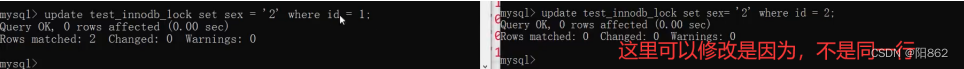 可以修改是因為上面的行鎖只對id=1的那兩行加了排他鎖