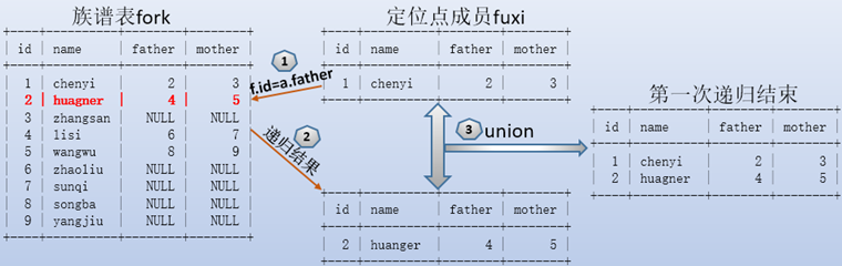 WITH recursive fuxi AS ( SELECT * FROM fork WHERE `name`="chenyi" UNION SELECT f.* FROM fork f JOIN fuxi a WHERE f.id=a.father)SELECT * FROM fuxi;