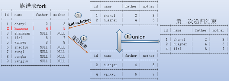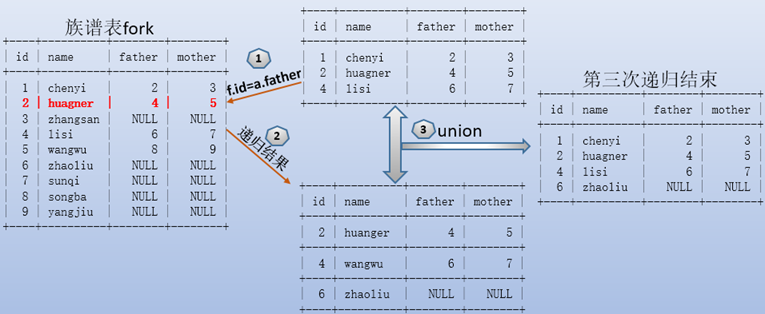 遞歸時,按照f.id=a.father的條件進行篩選,得到id=2的結果,該結果通過union和之前的數據結合起來,作為下一次遞歸的數據源fuxi。