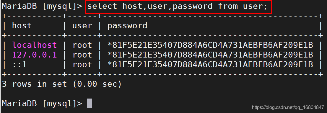 2).查詢user表中的host/root/password