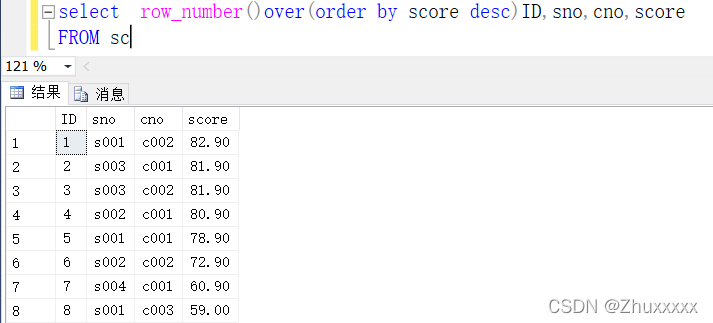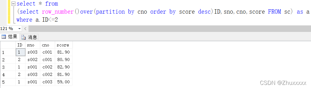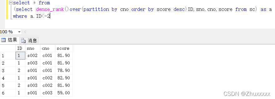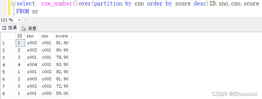可以看到ID的值以cno為分區(qū)進(jìn)行排序,當(dāng)cno變化時(shí)ID也會(huì)自動(dòng)重新開(kāi)始計(jì)數(shù),然后再將成績(jī)以降序排列,這樣每科成績(jī)高低及其對(duì)應(yīng)的學(xué)號(hào)就一目了然。