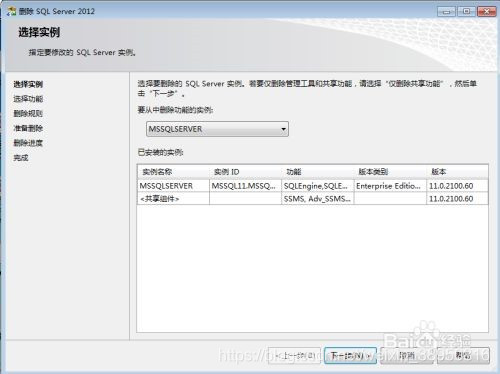 5、 這時進入“刪除SQL Server 2012”選擇實例,點擊“下一步”,如下圖所示