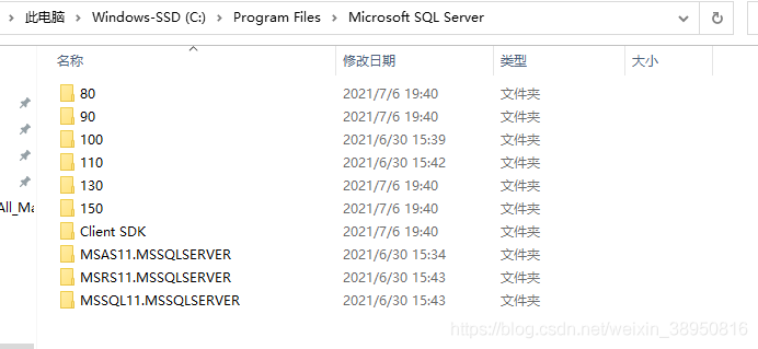 10、進入系統C盤,查看SQL Server文件夾(整個刪除包括父級目錄Microsoft SQL Server文件夾,如果文件目錄是在D盤/其他盤 同理刪除),選中刪除這些文件夾,如下圖所示: