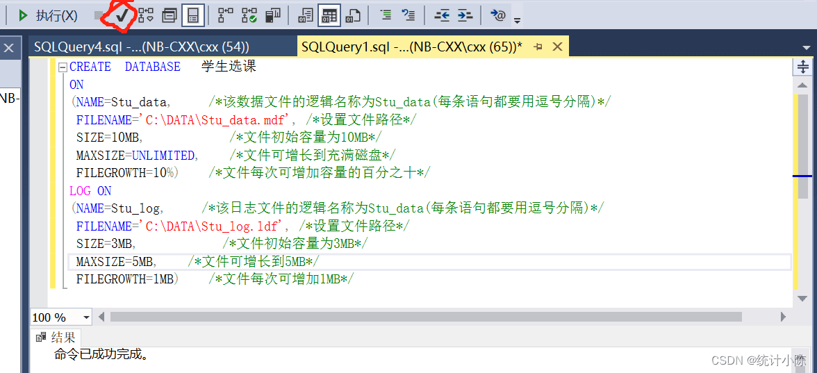 CREATE DATABASE 學生選課ON (NAME=Stu_data, /*該數據文件的邏輯名稱為Stu_data(每條語句都要用逗號分隔)*/ FILENAME="C:\DATA\Stu_data.mdf", /*設置文件路徑*/ SIZE=10MB, /*文件初始容量為10MB*/ MAXSIZE=UNLIMITED, /*文件可增長到充滿磁盤*/ FILEGROWTH=10%) /*文件每次可增加容量的百分之十*/LOG ON (NAME=Stu_log, /*該日志文件的邏輯名稱為Stu_data(每條語句都要用逗號分隔)*/ FILENAME="C:\DATA\Stu_log.ldf", /*設置文件路徑*/ SIZE=3MB, /*文件初始容量為3MB*/ MAXSIZE=5MB, /*文件可增長到5MB*/ FILEGROWTH=1MB) /*文件每次可增加1MB*/