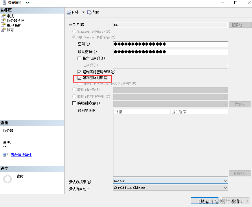 到此這篇關(guān)于SQLServer數(shù)據(jù)庫(kù)密碼短時(shí)間強(qiáng)制過(guò)期的解決的文章就介紹到這了,更多相關(guān)SQLServer密碼強(qiáng)制過(guò)期內(nèi)容請(qǐng)搜索以前的文章或繼續(xù)瀏覽下面的相關(guān)文章希望大家以后多多支持!