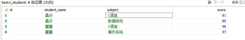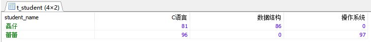 select student_name, sum(case ts.subject when "C語言" then ts.score else "" end) as C語言, sum(case ts.subject when "數據結構" then ts.score else "" end) as 數據結構, sum(case ts.subject when "操作系統" then ts.score else "" end) as 操作系統from t_student tsgroup by ts.student_name;