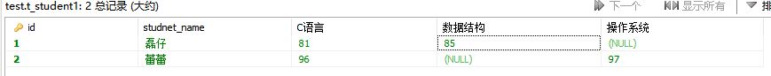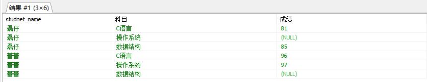 select ts.studnet_name,"C語言" as 科目,ts.`C語言` as 成績from t_student1 tsunion allselect ts.studnet_name,"數據結構" as 科目,ts.`數據結構` as 成績from t_student1 tsunion allselect ts.studnet_name,"操作系統" as 科目,ts.`操作系統` as 成績from t_student1 tsorder by studnet_name,科目